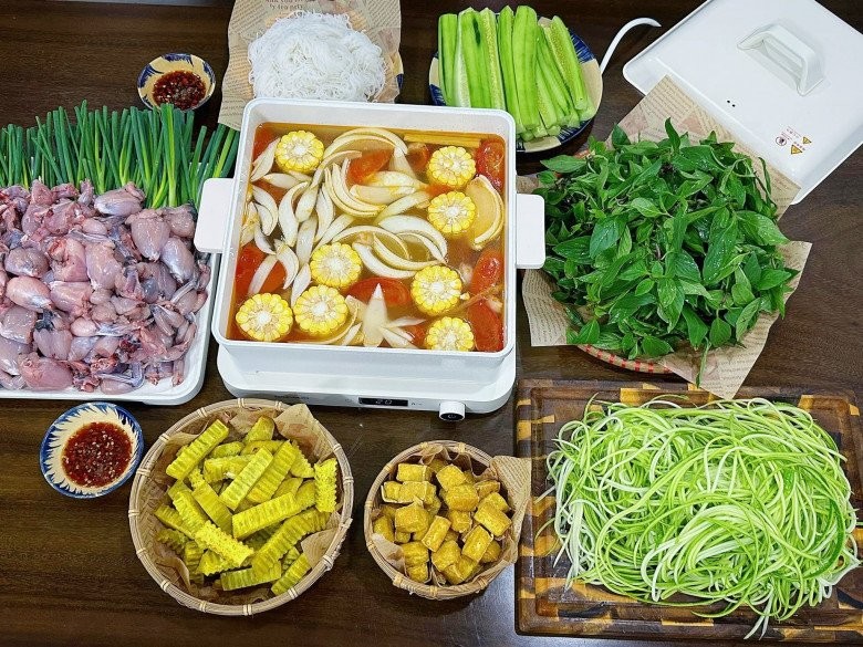Bày các nguyên liệu như rau, ốc, đậu, mọc ốc… ra rồi cùng gia đình thưởng thức nhé!