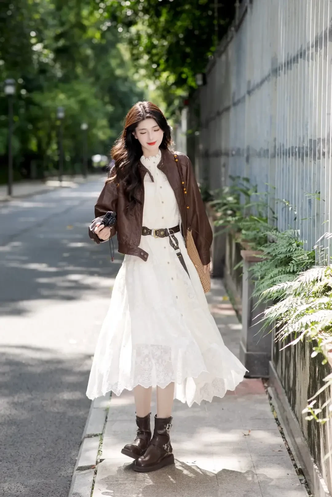 Áo khoác da là món đồ kinh điển mang đến vẻ ngoài cá tính và sành điệu. Một chiếc áo khoác da ngắn màu nâu khoác ngoài váy ren trắng, kết hợp thắt lưng và bốt cổ ngắn cùng tông sẽ tạo nên tổng thể hài hòa. Sự pha trộn giữa nét mạnh mẽ và nữ tính giúp set đồ vừa thời trang vừa cuốn hút, rất phù hợp để dạo phố mùa xuân.