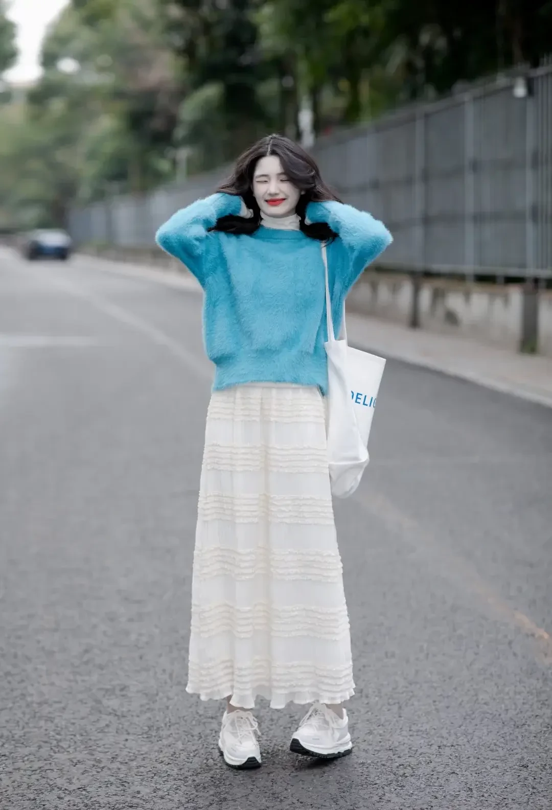 Một chiếc áo len màu xanh hồ với gấu áo xếp ly mang đến điểm nhấn mềm mại cho tổng thể trang phục. Khi kết hợp cùng chân váy midi trắng và khoác ngoài áo len cổ lọ trắng, set đồ trở nên hài hòa, thanh lịch. Hoàn thiện bằng giày trắng và túi vải bố, tổng thể toát lên vẻ dịu dàng, nữ tính và tinh tế.