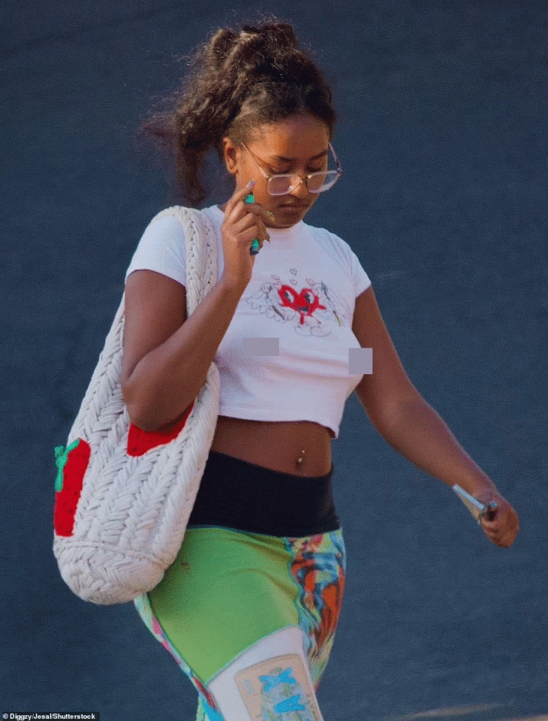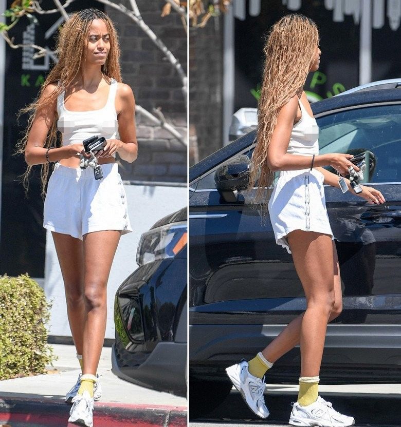 Đến salon làm đẹp, Malia cũng chỉ diện đồ thoải mái hết mức khi trưng dụng mốt "quên nội y". Cây đồ trắng gồm quần đùi thể thao và áo ba lỗ croptop màu trắng nhỏ xíu, để lộ gần như hoàn toàn vòng hai. Con gái lớn của cựu Tổng thống Barack Obama kết hợp trang phục với đôi giày thể thao New Balance cũng màu trắng và đi đôi tất cao cổ màu vàng.