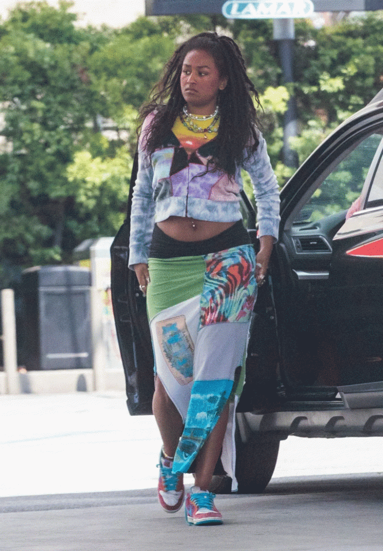 Mới đây nhất, con gái út Sasha bị bắt gặp xuất hiện trên đường phố Los Angeles khi đang đi đến tiệm làm đẹp. Để phù hợp với hoàn cảnh, cô sinh viên 21 tuổi diện đồ thoải mái, kết hợp giữa croptop và chân váy maxi.