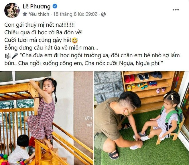 Trước đó, Lê Phương cũng có bài đăng thuật lại một ngày đi học của con gái. Cô bé được bố Trung Kiên đưa đón, tỏ ra rất vui vẻ. Nhìn những hình ảnh này, nhiều người "tan chảy" trước sự quan tâm dịu dàng của chồng trẻ Lê Phương dành cho ái nữ.