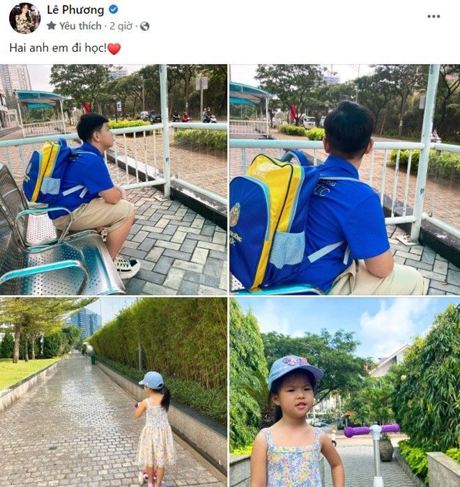 Trên trang cá nhân, Lê Phương vừa đăng tải loạt khoảnh khắc của 2 con cưng khi đến trường kèm theo dòng chú thích ngọt ngào: "2 anh em đi học". Về con trai Cà Pháo, nữ diễn viên nói bằng giọng hóm hỉnh: "Anh hai dậy sớm quá nên hơi mơ màng nhưng rất là háo hức để được đi học". Khi một người bạn hỏi thăm, Lê Phương tiết lộ: "Hôm qua đi học về khoe nhiều thứ lắm, thấy Pháo vui và thích đi học lắm nên em cũng mừng. Cuối tuần mình thưởng tụi nhỏ nha".