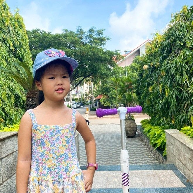 Ngoài ra, Lê Phương cũng "than thở" con gái nghịch ngợm với bức ảnh cô bé trèo lên cả tay vịn bậc thang khu vui chơi cùng biểu cảm "ngây thơ vô số tội". Nữ diễn viên viết: "Con gái thuỳ mị nết na. Chiều qua đi học có ba đón về. Cười tươi mà cũng gây hề. Bỗng dưng câu hát ùa về miên man... 'Cha đưa em đi học ngôi trường xa, đôi chân em bé nhỏ sợ lấm bùn. Cha ngồi xuống cõng em. Cha nói cưỡi ngựa, ngựa phi'".