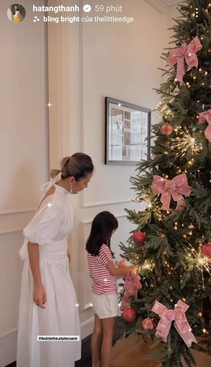 3 con Tăng Thanh Hà giúp mẹ trang trí cây thông Noel.