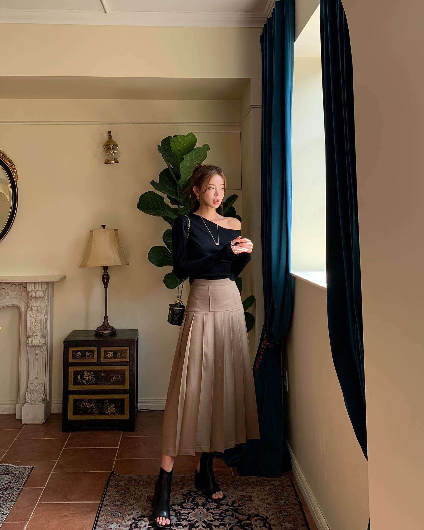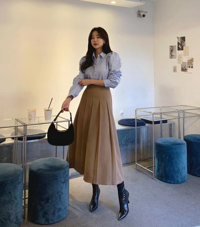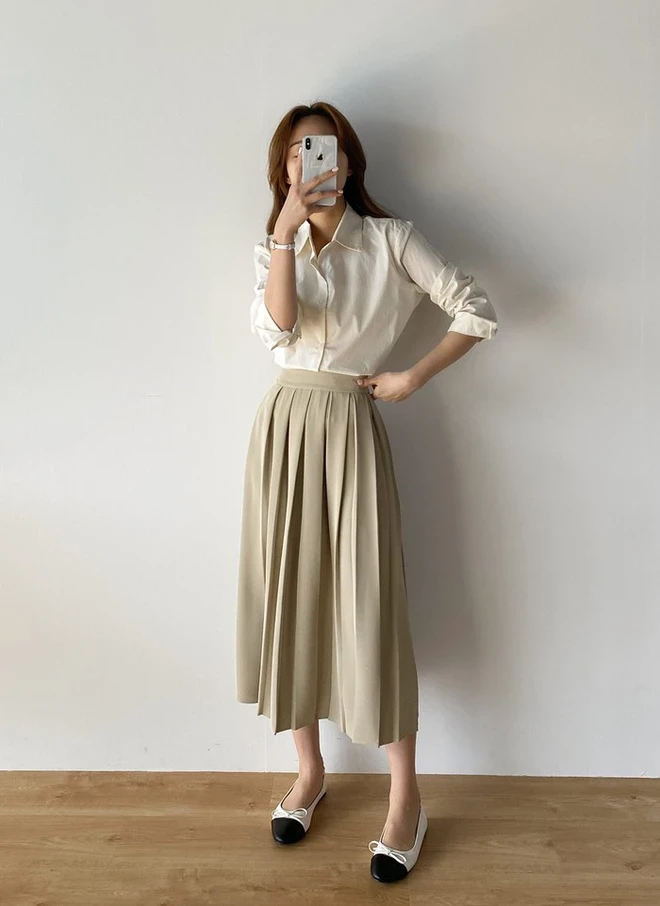 Chân váy xếp ly còn có lợi thế là dễ tạo điểm nhấn cho trang phục mà không cần phụ kiện cầu kỳ. Chỉ cần một đôi giày bệt hoặc giày cao gót mũi nhọn, chị em đã có thể hoàn thiện set đồ công sở vừa thoải mái vừa duyên dáng.