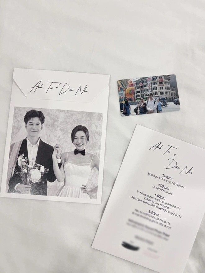 Theo thông tin trên thiệp mời, đám cưới sẽ diễn ra ngày 10/10 tại quê nhà cô dâu ở Phan Thiết. Trên thiệp là hình ảnh Diệu Nhi - Anh Tú đan chặt tay nhau, cùng nở nụ cười rạng rỡ. Điểm nhấn chính là màn hoán đổi của bộ đôi khi Anh Tú điển trai nhưng lại đội khăn voan trắng của cô dâu, còn Diệu Nhi lém lỉnh đeo nơ vốn dành cho chú rể.
