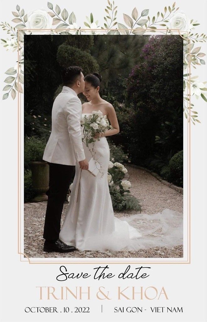 Một nghệ sĩ Vbiz khác sẽ tổ chức đám cưới trùng ngày với Diệu Nhi - Anh Tú là MC Liêu Hà Trinh. Trước đó, ekip của nữ MC thông báo hôn lễ của cô diễn ra vào ngày 10/10/2022 tại TP.HCM. Thiệp cưới của Liêu Hà Trinh và bạn trai doanh nhân khá đơn giản với màu trắng chủ đạo.