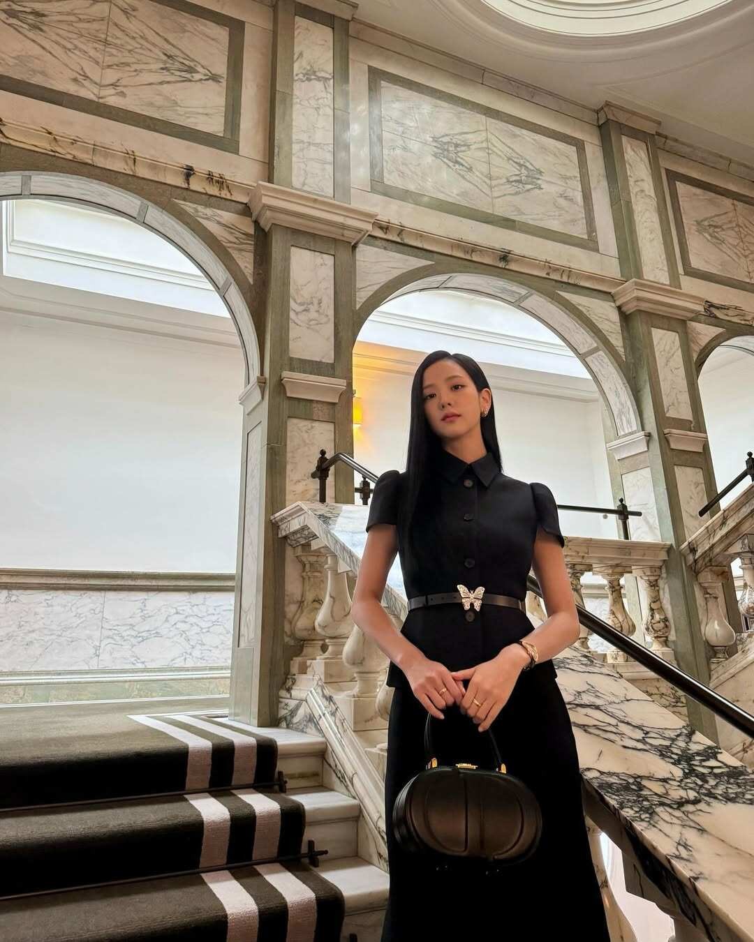 Chân váy ngắn, đặc biệt là kiểu dáng chữ A, giúp làm nổi bật đôi chân và cải thiện tỷ lệ hình thể. Khi kết hợp cùng áo blazer lửng có độ dài ngang hông, tổng thể trang phục trở nên gọn gàng, liền mạch, từ đó tạo hiệu ứng kéo dài chiều cao. Cách phối đồ đồng bộ này của Jisoo không chỉ tôn dáng mà còn mang lại diện mạo thanh lịch, hiện đại, phù hợp với nhiều độ tuổi.