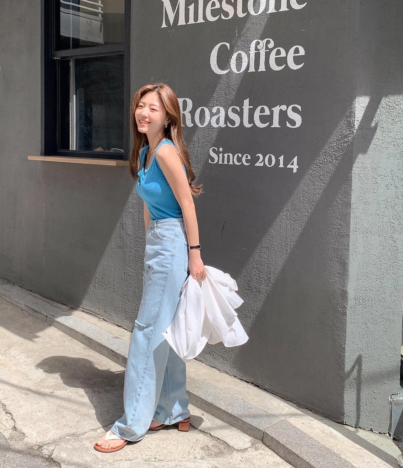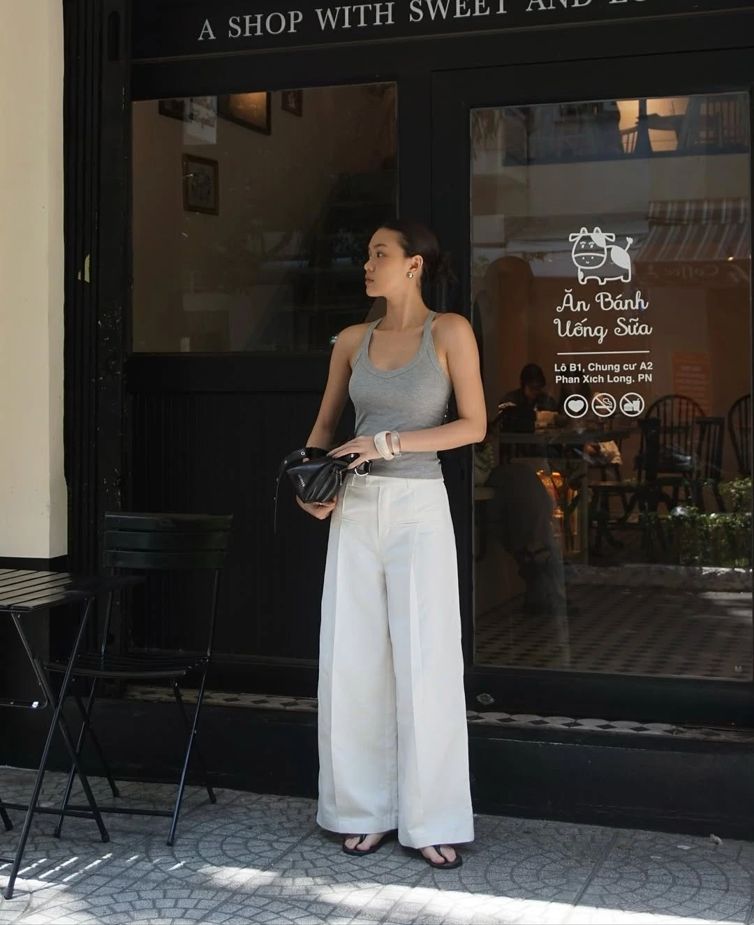 Nếu bạn yêu thích phong cách tối giản nhưng vẫn muốn giữ nét năng động, trẻ trung, quần ống rộng kết hợp cùng áo sát nách là lựa chọn rất đáng thử. Thiết kế không tay giúp tổng thể trở nên thoáng mát, đặc biệt phù hợp với những chuyến du lịch mùa hè hoặc các điểm đến có thời tiết nóng.