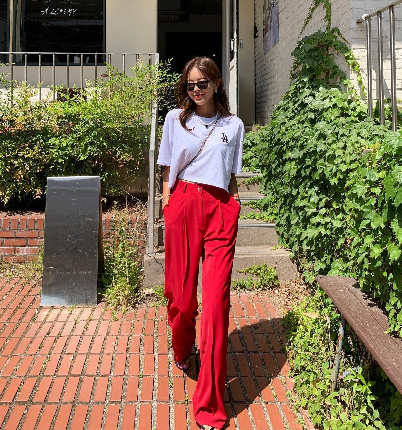 Khi muốn “thuần hóa” những chiếc quần ống rộng có tông màu nổi bật, áo thun trơn màu chính là lựa chọn an toàn nhưng đầy hiệu quả. Sự tối giản ở phần trên giúp cân bằng tổng thể, đồng thời vẫn giữ được điểm nhấn thị giác cho outfit. Những phụ kiện như kính mắt hay vòng cổ ngọc trai lúc này không hề dư thừa, mà ngược lại còn góp phần hoàn thiện diện mạo, tăng độ tinh tế mà không phá vỡ sự hài hòa.