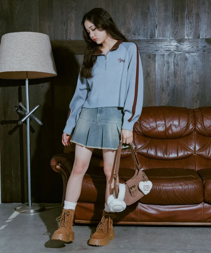 Để trung hòa vẻ trung tính, hơi “menswear” của áo cổ khóa kéo ¼, bạn nên ưu tiên những thiết kế ngắn hoặc gam màu nhẹ nhàng để tăng nét nữ tính. Một chiếc chân váy mini cạp cao sẽ giúp đôi chân trông dài hơn, đồng thời làm tổng thể trở nên trẻ trung và gọn gàng.