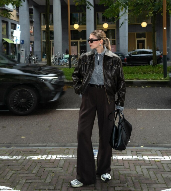 Sự đối lập giữa bề mặt da bóng, cứng cáp và chất len mềm mại giúp set đồ trông có chiều sâu, vừa sang trọng vừa hiện đại. Chỉ cần giữ bảng màu trung tính như đen, nâu, be hoặc xám, bạn đã có ngay một outfit chuẩn phong cách đô thị, phù hợp cả khi đi làm lẫn dạo phố buổi tối.