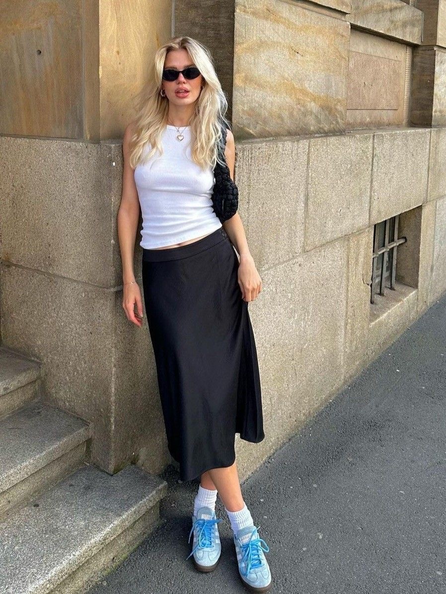 Chân váy lụa dáng midi tiếp tục được yêu thích nhờ chất liệu mềm mại, rũ nhẹ và tôn dáng. Gam màu kem, nâu sữa hay xám nhạt giúp tổng thể thanh lịch, dễ kết hợp cùng blazer hoặc sơ mi để tạo vẻ ngoài chuẩn chỉnh nơi công sở.