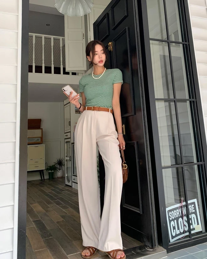 Phom quần ống suông hoặc ống rộng nhẹ, cạp cao được đánh giá cao vì khả năng tôn dáng và che khuyết điểm tốt. Khi phối cùng áo chấm bi hoặc áo kẻ ngang, quần sáng màu đóng vai trò cân bằng thị giác, khiến outfit trở nên hài hòa hơn. Điểm cần lưu ý là chọn chất liệu dày dặn để tránh lộ nội y và giữ form đứng dáng suốt cả ngày dài.