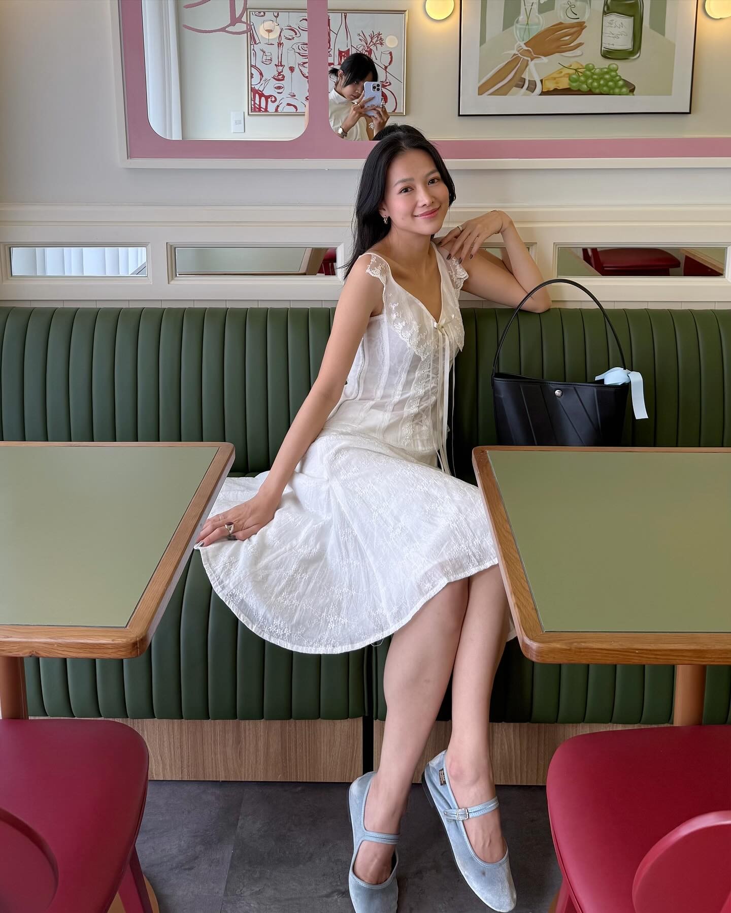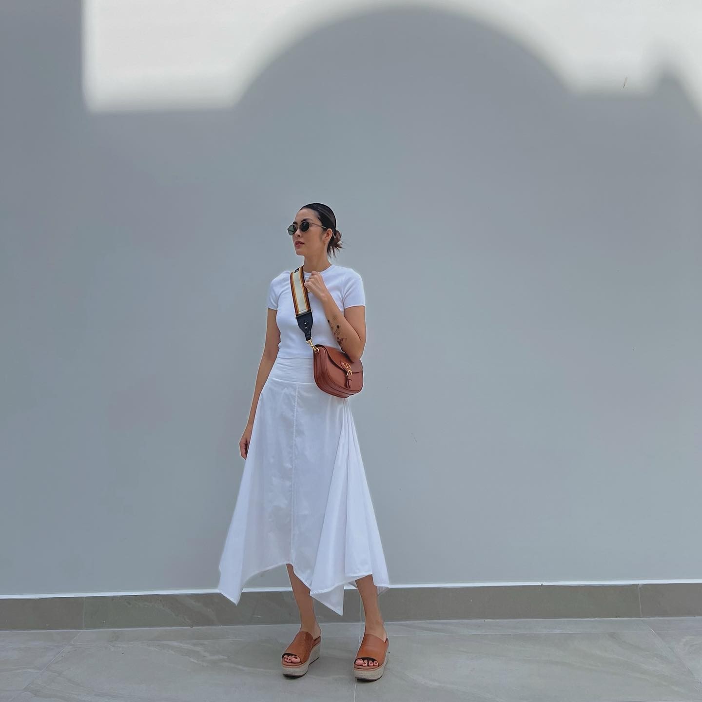 Chân váy trắng luôn là lựa chọn được các mỹ nhân Việt yêu thích nhờ vẻ ngoài nhẹ nhàng, tinh khôi. Gam màu này giúp tổng thể trang phục trở nên sáng sủa hơn, đồng thời tạo hiệu ứng “nâng tông” làn da, đặc biệt phù hợp trong những ngày thời tiết ấm áp.