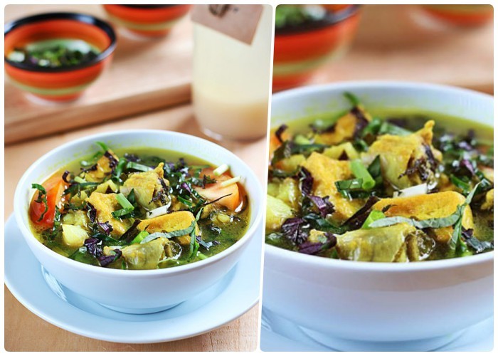 - Xào cà chua trong một chảo khác. Cho xương, chuối, đậu và cà chua vào nồi nước dùng, thêm dấm bỗng vừa miệng ăn, khi nước sôi nêm nếm lại gia vị và thêm các loại rau vào nồi, nước sôi trở lại thì tắt bếp.