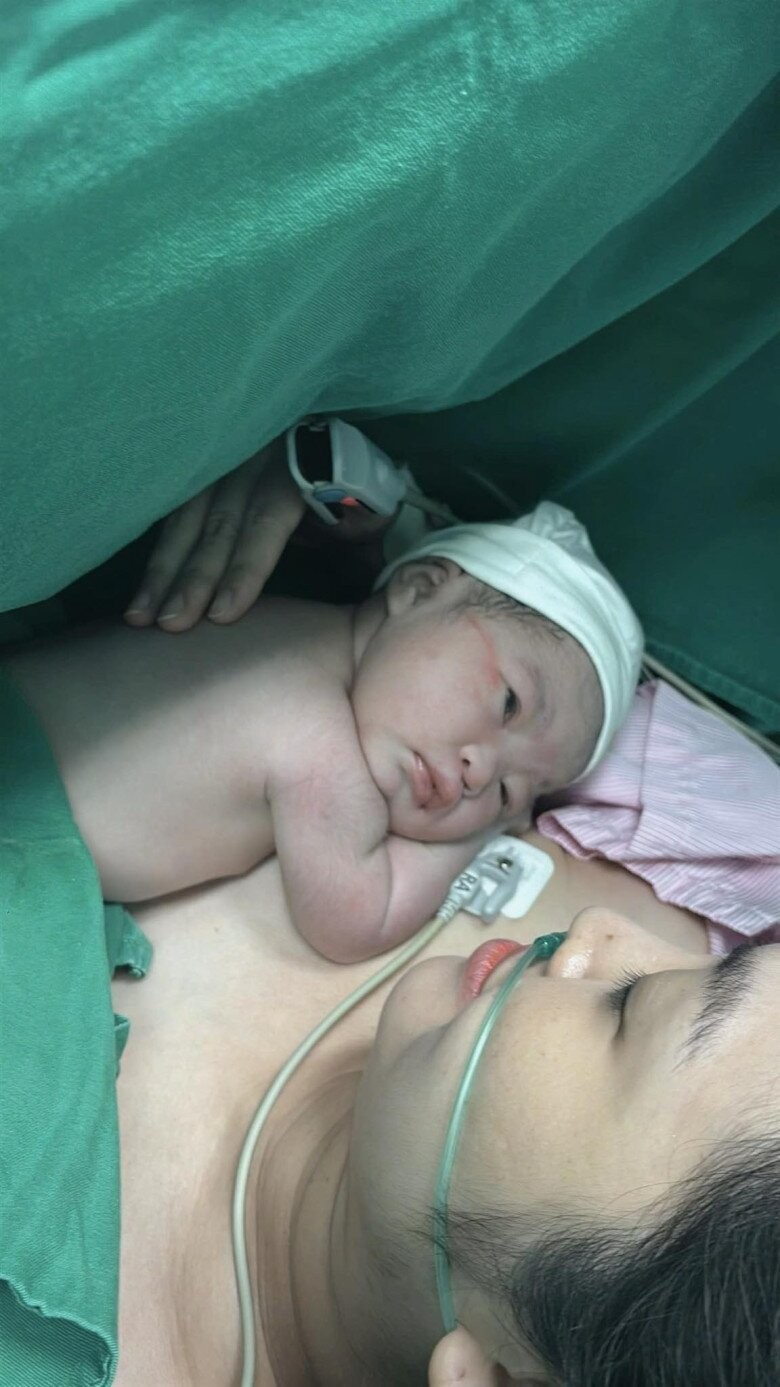 Khoảnh khắc 2 mẹ con Thùy Linh "da kề da" ngay sau sinh.