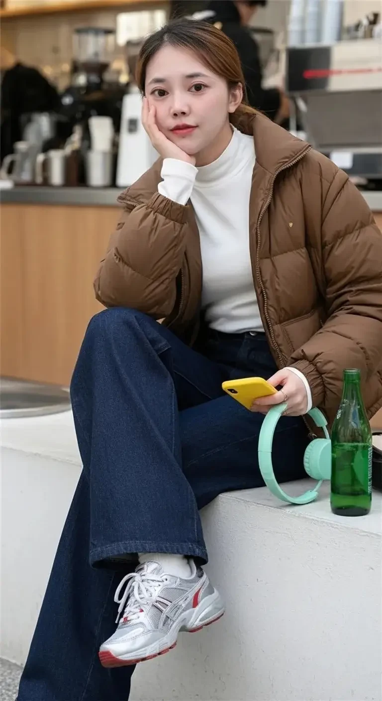 Áo phao ngắn màu caramel phối cùng quần jeans xanh denim và giày thể thao sáng màu tạo nên phong cách street style trẻ trung, phóng khoáng nhưng vẫn nhuốm nét retro.