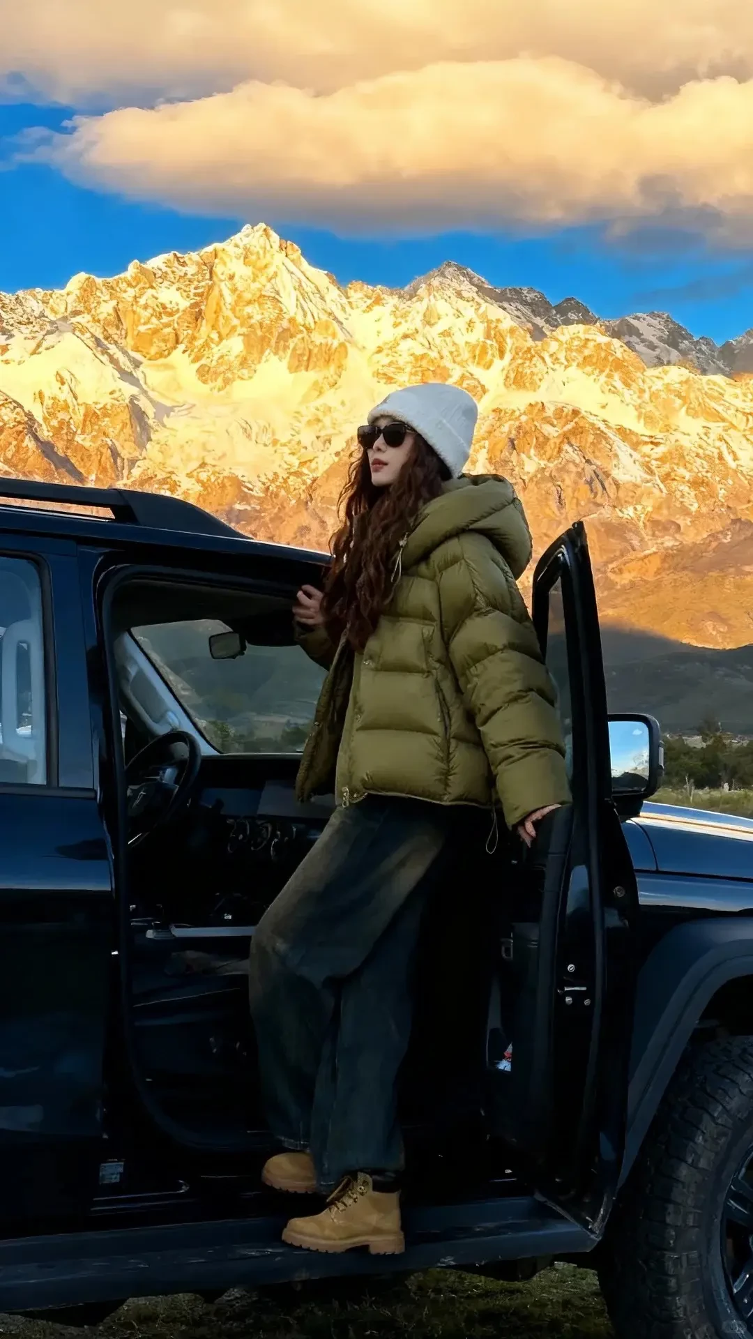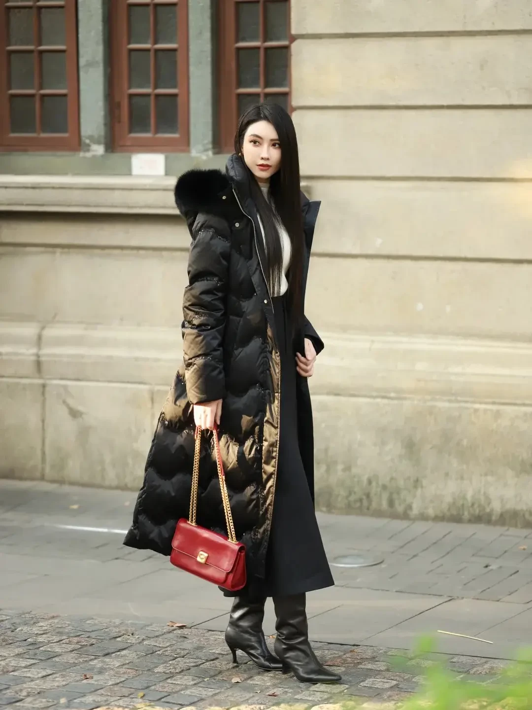 Áo phao dáng dài màu đen, phom suông kèm mũ viền lông, mang lại cảm giác sang trọng, mạnh mẽ và rất phù hợp với phong cách mùa đông thành thị; sắc đen cổ điển giúp tổng thể trở nên gọn gàng, thanh lịch, đồng thời làm nổi bật phụ kiện đi kèm.