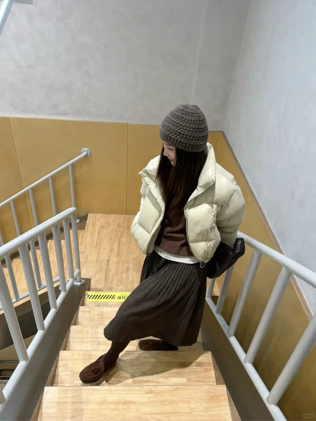 Áo gile phao màu trà sữa phối cùng chân váy xếp ly nâu và giày lười đồng màu mang đến vẻ ngoài nhã nhặn, phù hợp cho cả môi trường công sở lẫn những buổi hẹn hò nhẹ nhàng.