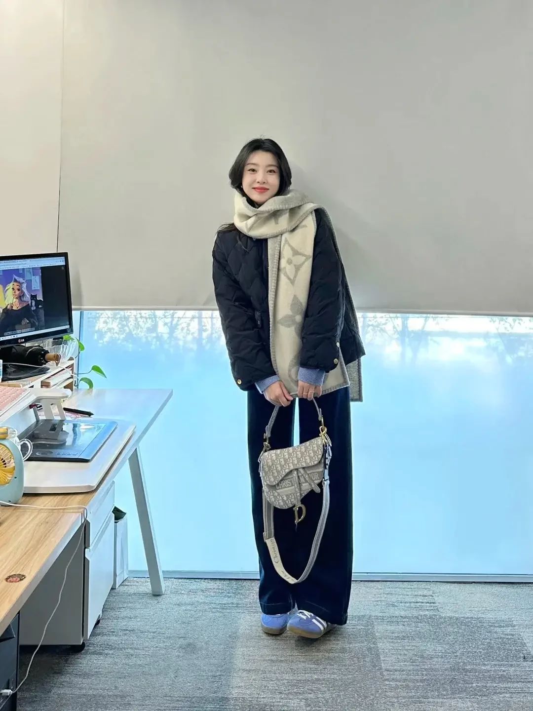 Với phụ nữ công sở, áo khoác phao xanh hải quân luôn là lựa chọn an toàn. Kiểu dáng ngắn phối cùng quần ống rộng và giày thể thao vừa thoải mái, tiện lợi lại vẫn gọn gàng, hiện đại.