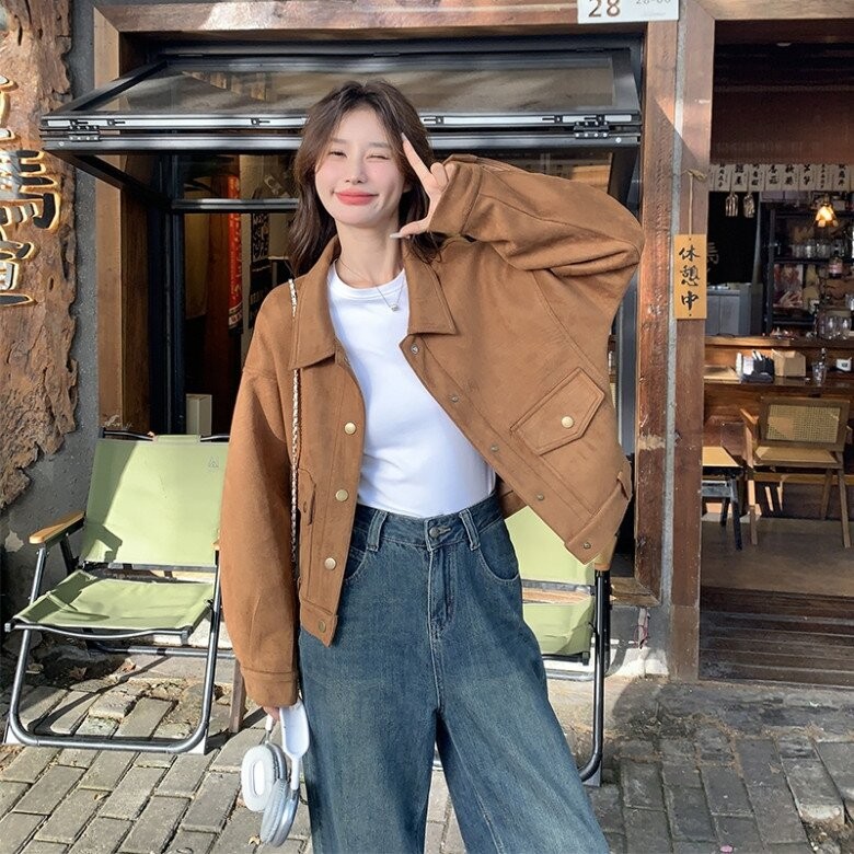 Áo khoác dáng ngắn phom boxy màu caramel, gam màu ấm áp tạo cảm giác gần gũi, dễ ứng dụng trong đời sống hằng ngày và hài hòa khi kết hợp cùng áo thun trắng và quần jeans xanh.