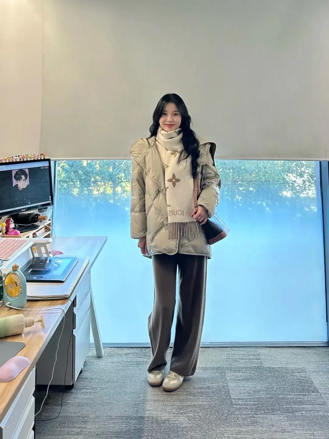 Trong khi đó, áo phao dáng lửng màu trà sữa kết hợp với quần ống đứng xám nhạt tạo nên tổng thể đơn sắc tinh tế, đơn giản nhưng vẫn rất thời trang, hoàn hảo cho việc di chuyển hằng ngày.
