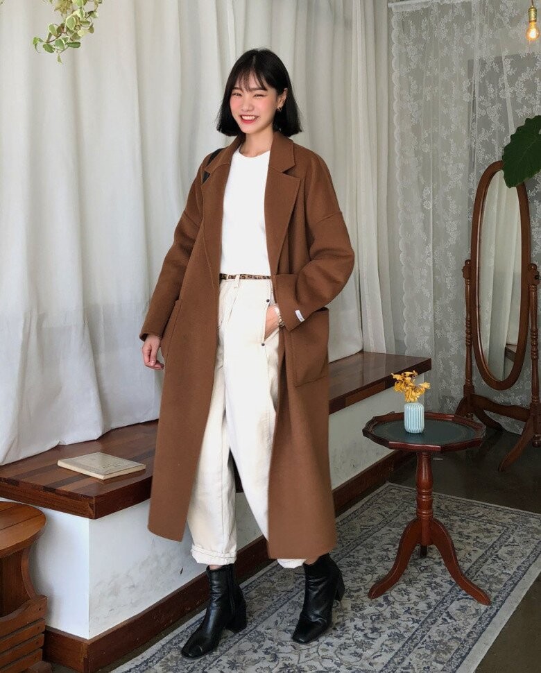 Phong cách thanh lịch, cổ điển với áo măng tô dáng dài màu caramel, phom áo rộng vừa phải tạo cảm giác chững chạc và thời thượng; sắc nâu ấm kết hợp cùng trang phục sáng màu bên trong giúp tổng thể cân bằng, nhã nhặn.