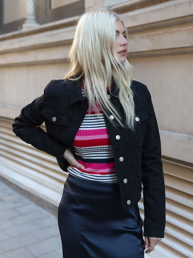 Nổi bật là áo khoác đen dáng jacket với phom cứng cáp, mạnh mẽ. Khi kết hợp cùng áo len kẻ nhiều màu và chân váy tối màu, set đồ tạo nên sự tương phản thú vị, vừa cá tính vừa thời thượng.