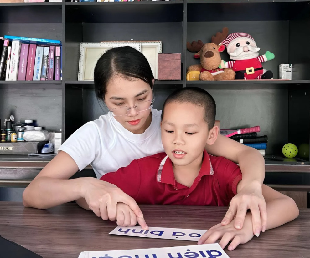 Mỗi ngày, chị dành nhiều thời gian để tập cho con phát âm từng từ đơn giản, gọi tên đồ vật quen thuộc, luyện phản xạ khi được gọi tên. Từ cái ly, cái ghế, đôi dép cho đến những hành động rất cơ bản, tất cả đều được chị kiên trì hướng dẫn và lặp lại nhiều lần.
