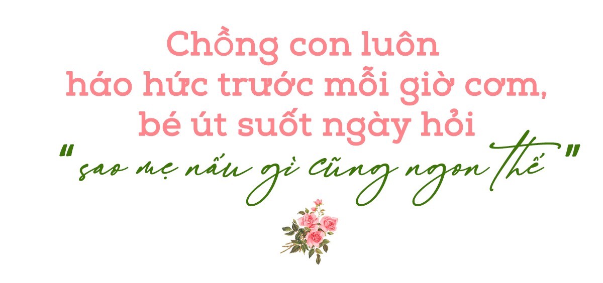 Chồng và các con chị luôn háo hức mỗi khi đến giờ ăn. Đặc biệt, cậu út có lần hồn nhiên nói: “Mẹ ơi, sao mẹ nấu gì cũng ngon thế, con yêu mẹ lắm. Có phải vì mẹ yêu con nên mẹ mới nấu cơm ngon cho con ăn không ạ?”. Những lời nói giản dị ấy chính là điều khiến chị thêm gắn bó với căn bếp và trân trọng từng bữa cơm gia đình.