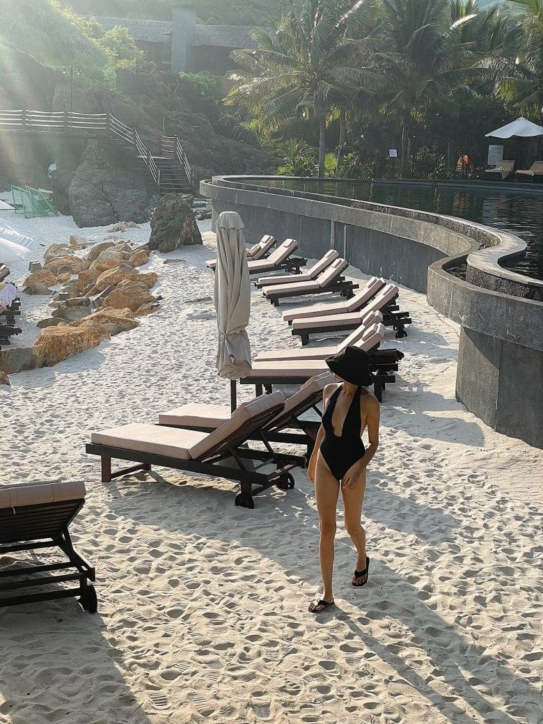 Lệ Hằng diện đồ tắm một mảnh, tóc cột tự nhiên và mix kèm chiếc mũ năng động để tôn lên sự trẻ trung và tràn đầy năng lượng mà cô đang có.