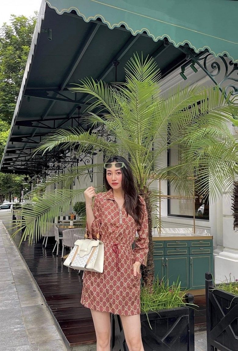 Hay như bộ váy màu nâu đỏ với hoa văn đặc trưng của Gucci có giá hơn 1800USD được cô phối cùng chiếc túi mang tên một thành phố tại Việt Nam - Goyard Saigon Top Handle Bag Coated Canvas có giá hơn 6000USD tạo nên một bộ outfit vừa năng động lại rất sang chảnh.