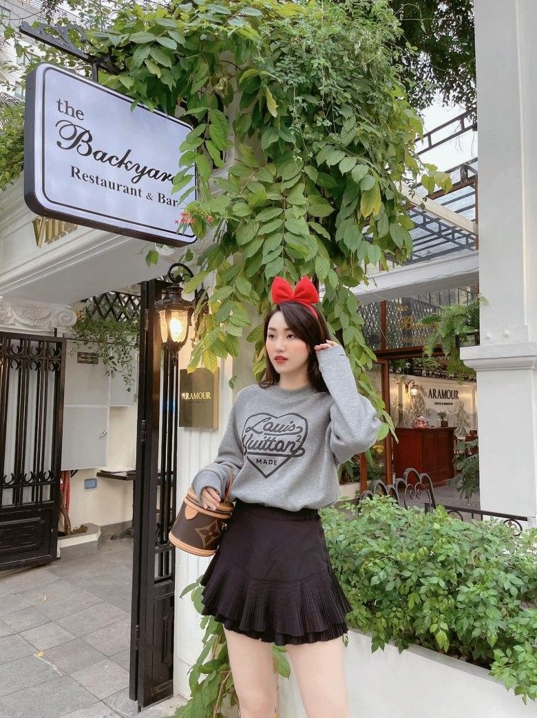 Đặc biệt, mỗi lần lên hình, Trà My luôn gắn với một chiếc túi hiệu hay một item hàng hiệu nào đó. Ví như trong bức ảnh này, không chỉ diện chiếc áo thun từ nhà Louis Vuitton với chân váy xòe. Để thêm phần đồng điệu, mỹ nhân Hà thành dùng thêm chiếc túi hộp từ cùng thương hiệu. Được biết, chiếc túi dạng trụ tròn này là phiên bản giới hạn, có giá gần 3000USD.