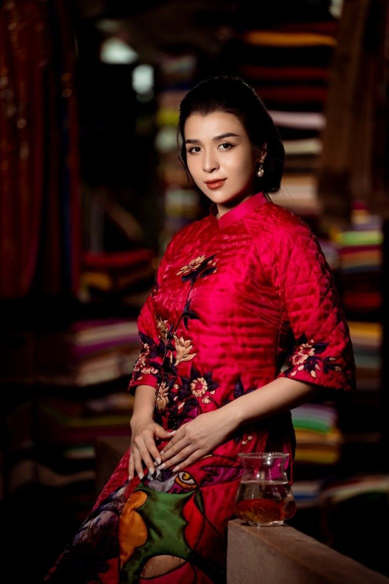 Với mẫu áo dài cách tân, Hoàng Thùy Anh lựa chọn không gian chụp là một sạp vải nhiều màu sắc.