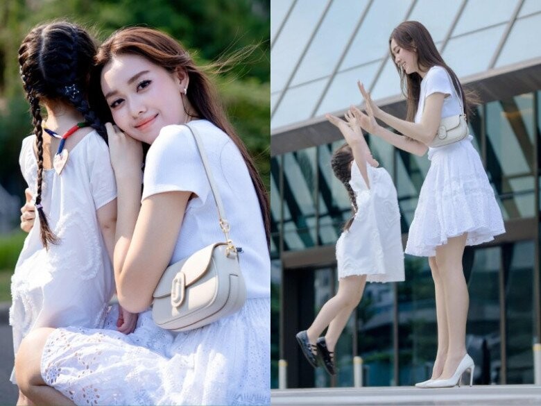 Qua những bức hình nghiêng mặt thấy được con gái thừa hưởng nhiều nét đẹp từ mẹ Tường San, cô nhóc cao lớn phổng phao, có mái tóc dài và làn da trắng giống mẹ.