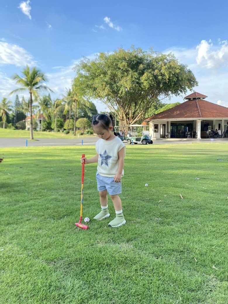 Khoảnh khắc nhóc tỳ Suchin được bố Cường Đô La tập tành chơi môn golf - môn thể thao yêu thích của doanh nhân phố núi, đốn tim nhiều cư dân mạng. Đặc biệt, trang phục chơi golf của ái nữ nhà Đàm Thu Trang cũng gây chú ý vì trông vô cùng nhí nhảnh và năng động.