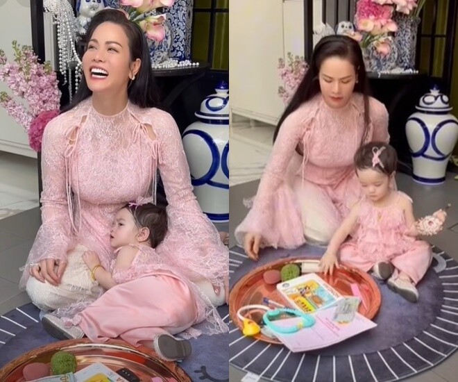 Nữ diễn viên cũng để cho con gái thực hiện hoạt động “bốc đồ đoán tương lai” trong ngày sinh nhật 1 tuổi. Trong một mâm đồ gồm sổ đỏ, tiền, ống nghe bác sĩ, sách, gương, micro,... thì bé Julia ngay lập tức cầm lấy chiếc micro và 1 chiếc gương. Nhóc tì sau đó đã rất kiên trì với lựa chọn của mình.
