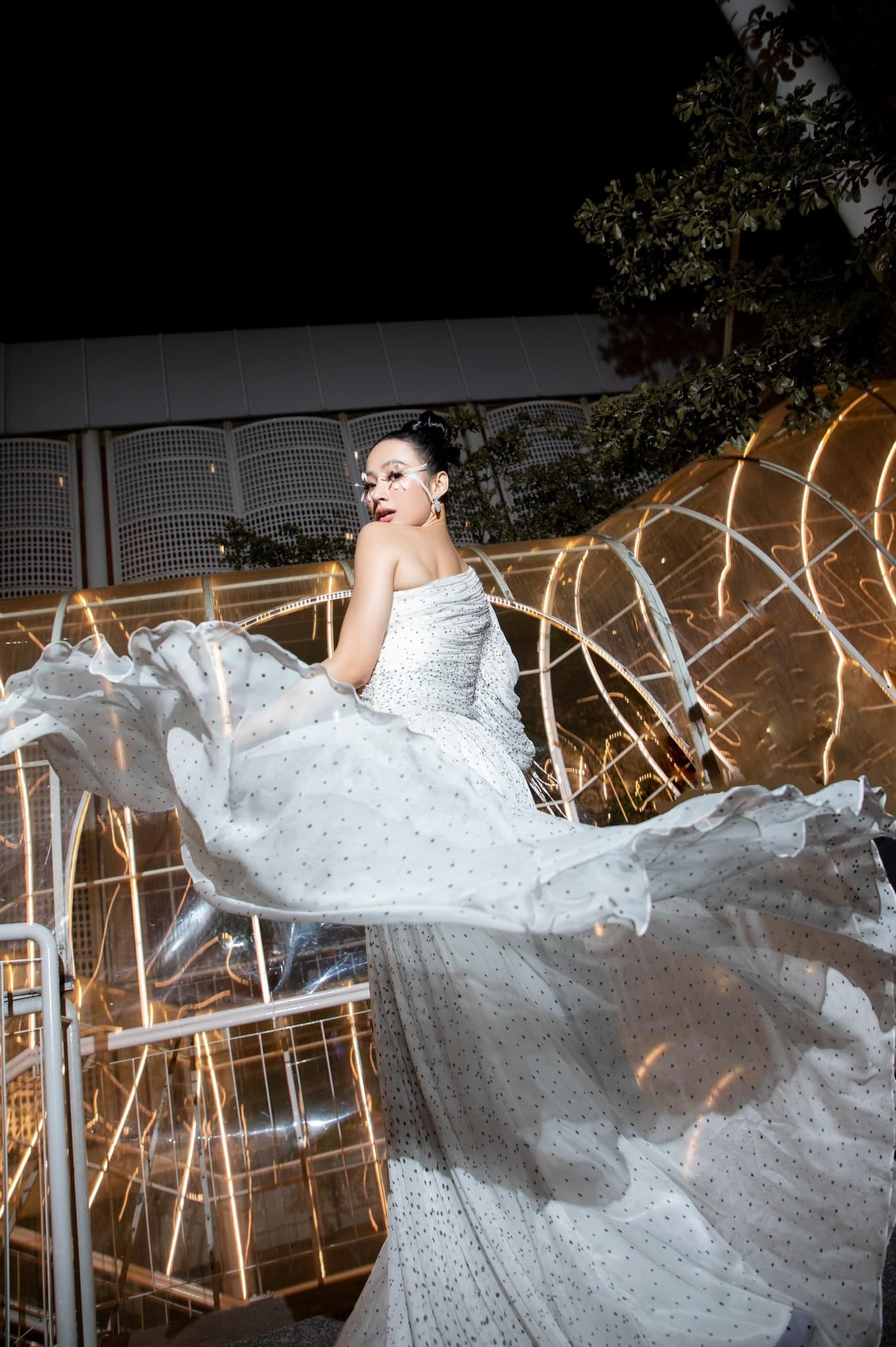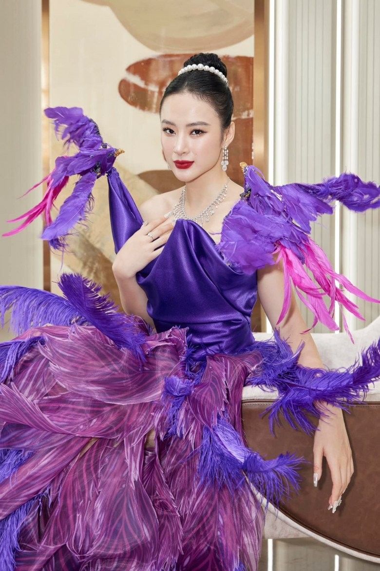 Chân dài đi sự kiện nhưng cũng mặc cả đầm đính thiết bị điện tử chẳng kém các "chiến binh hương sắc" tại các phần thi Trang phục dân tộc của các đấu trường Hoa hậu Quốc tế. Thiết kế màu tím này của nữ diễn viên có 2 con chim liên tục vỗ cánh không nghỉ trong suốt sự kiện.