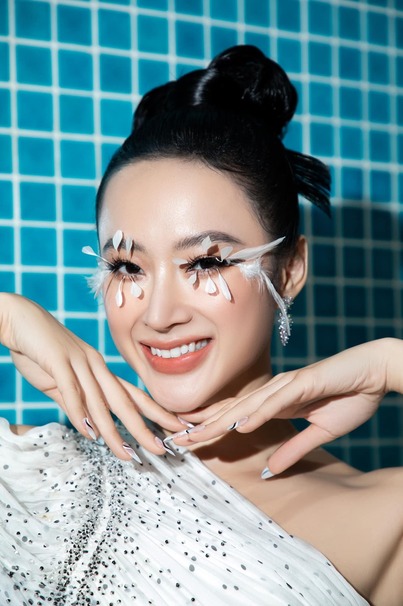 Cô cũng làm mới mình với các layout make-up đậm chất high-fashion với việc đính lông vũ lên mặt. Người đẹp phải mất 2-3 tiếng đồng hồ thậm chí là 5 tiếng để kì công chuẩn bị cho mỗi lần "trẩy hội".