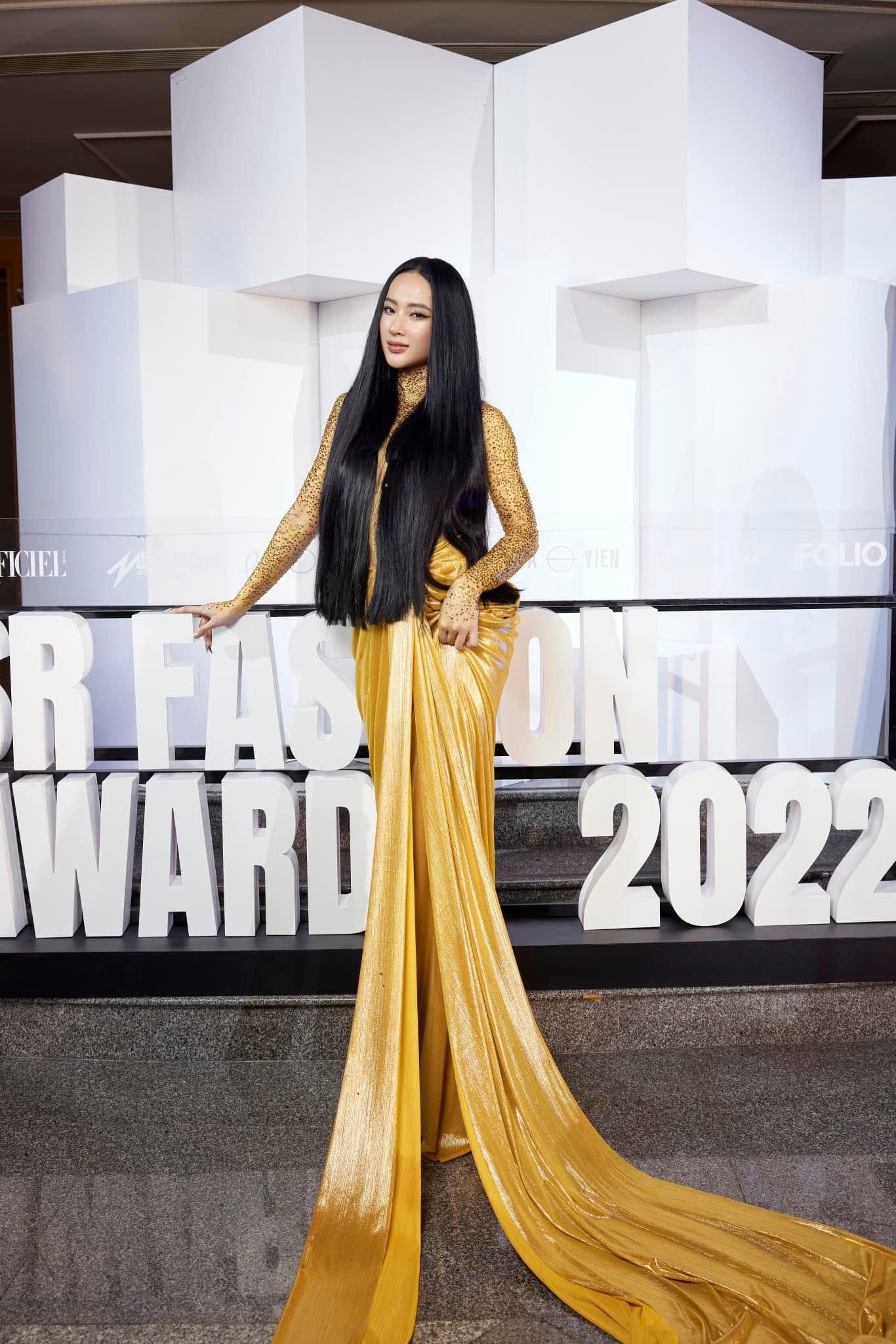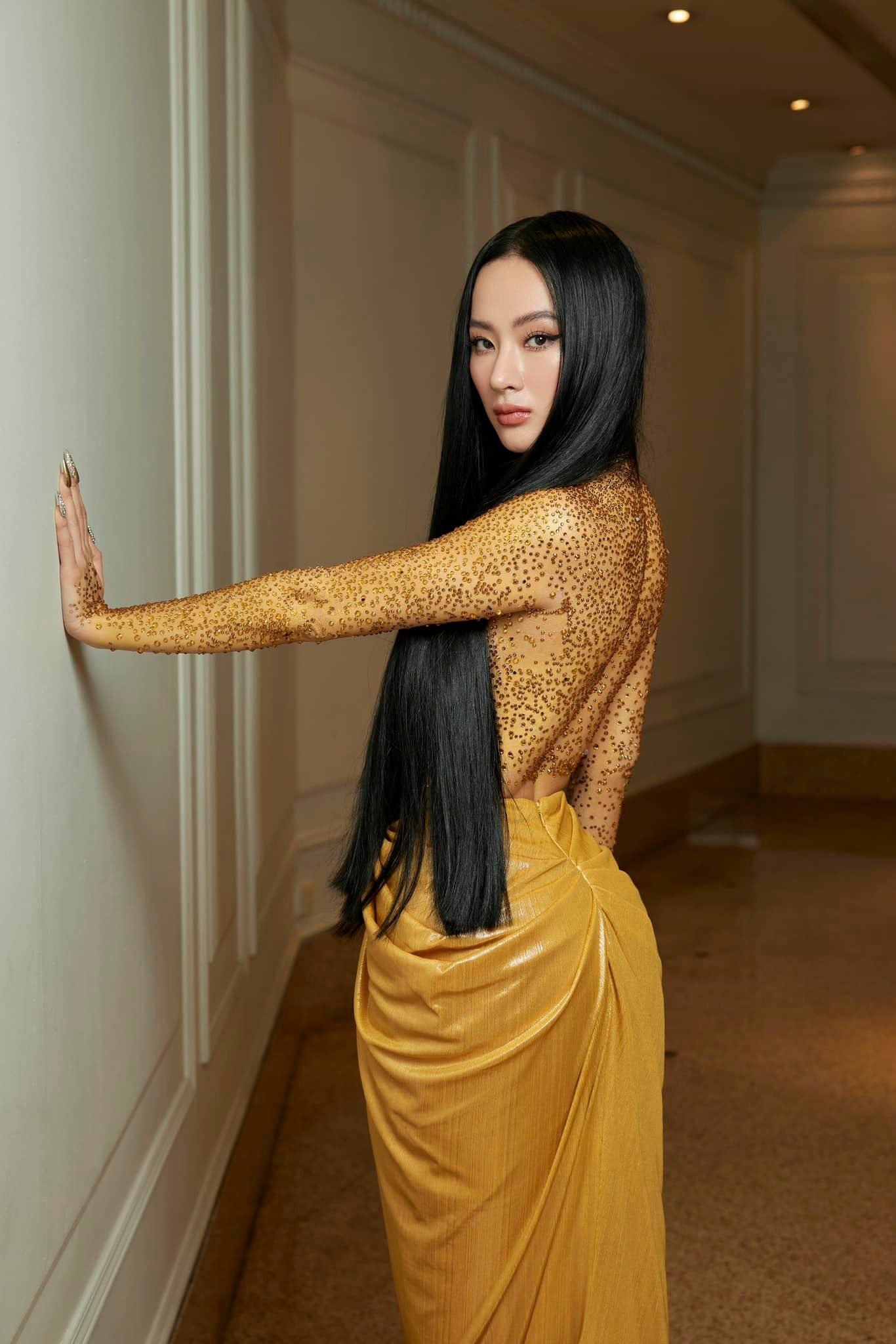Shock bậc nhất có lẽ là màn xuất hiện với thiết kế khoe thắt đáy lưng ong với phần thân trên bán nude toàn tập. Cô đính đá và lấy tóc che ngực.