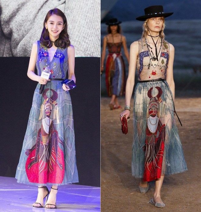 Angelababy cũng lót thêm một lớp vải cùng màu với thiết kế gốc để không bị hở hang, phản cảm.