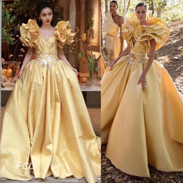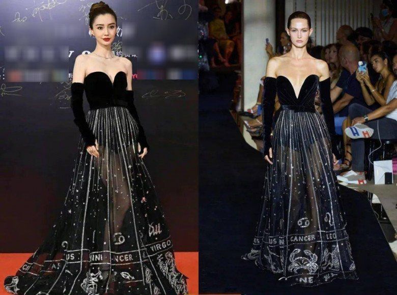Xuất hiện trong một sự kiện cách đây không lâu, Angelababy diện chiếc váy cúp ngực với phần chân váy xuyên thấu. Tuy nhiên, nếu nhìn kỹ sẽ thấy nữ diễn viên đã khâu lại phần xẻ ngực sâu của bộ trang phục gốc vì nếu giữ nguyên thiết kế này sẽ "phơi bày" vòng 1 khiêm tốn của cô. Chiếc áo trở thành kiểu dáng cúp ngực giúp tạo hiệu ứng đầy đặn hơn.
