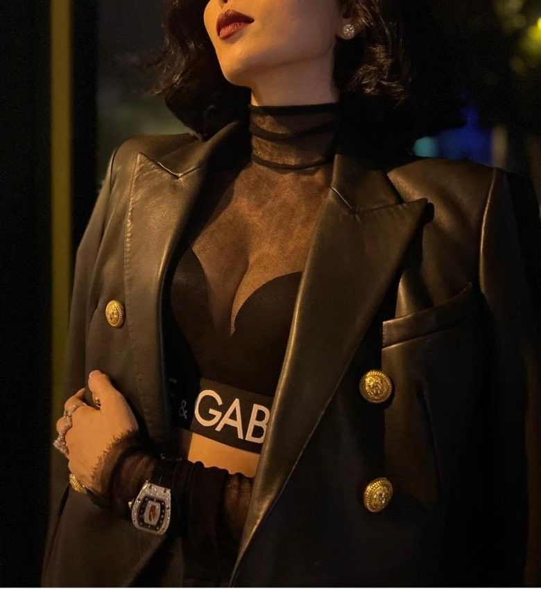 Nữ ca sĩ trước đây đã từng phối vest da sang chảnh cùng chiếc áo xuyên thấu trong suốt thấy rõ nội y này để đi diễn, cô làm cho sân khấu nóng hơn bao giờ hết với sự xuất hiện sang chảnh và thời thượng của mình.