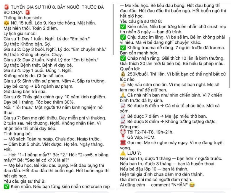 Bài đăng tuyển gia sư thứ 8 cho con khiến nhiều người bất ngờ.