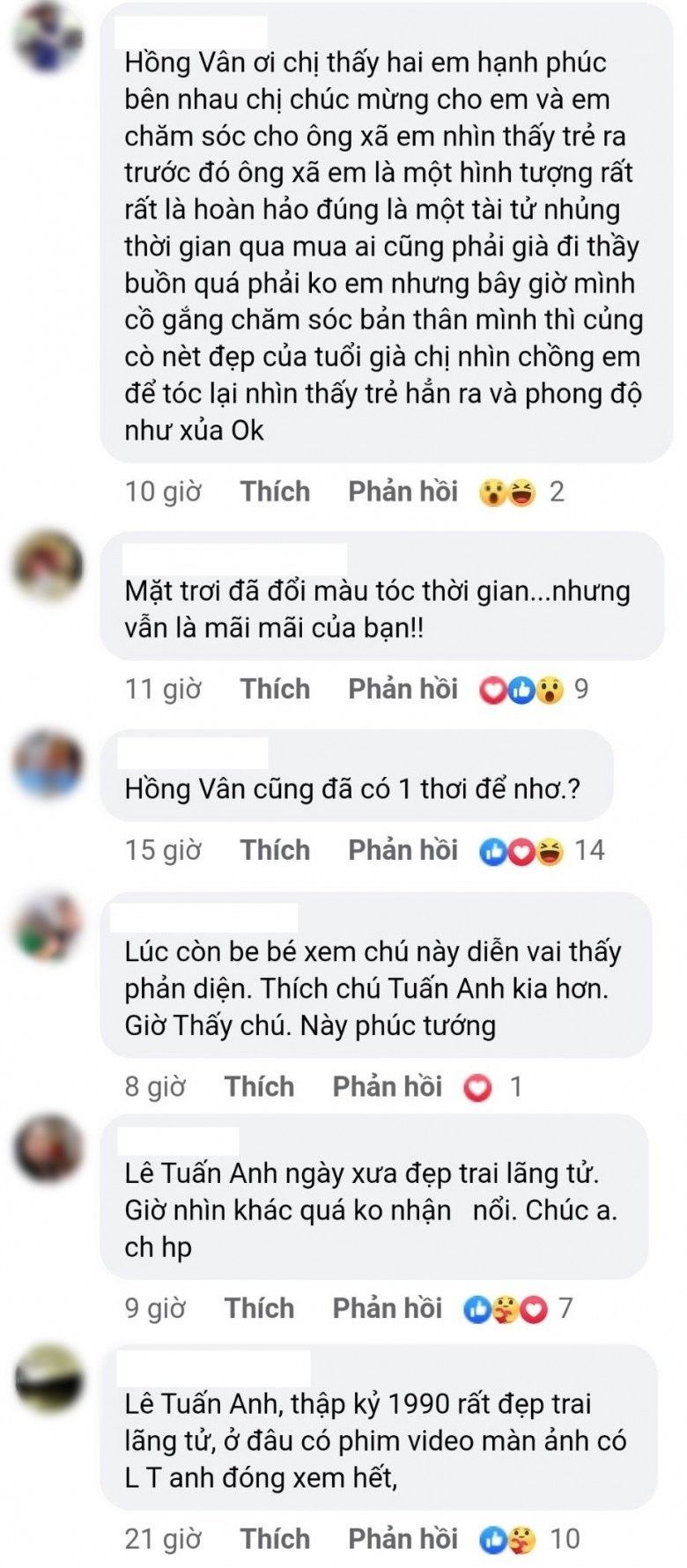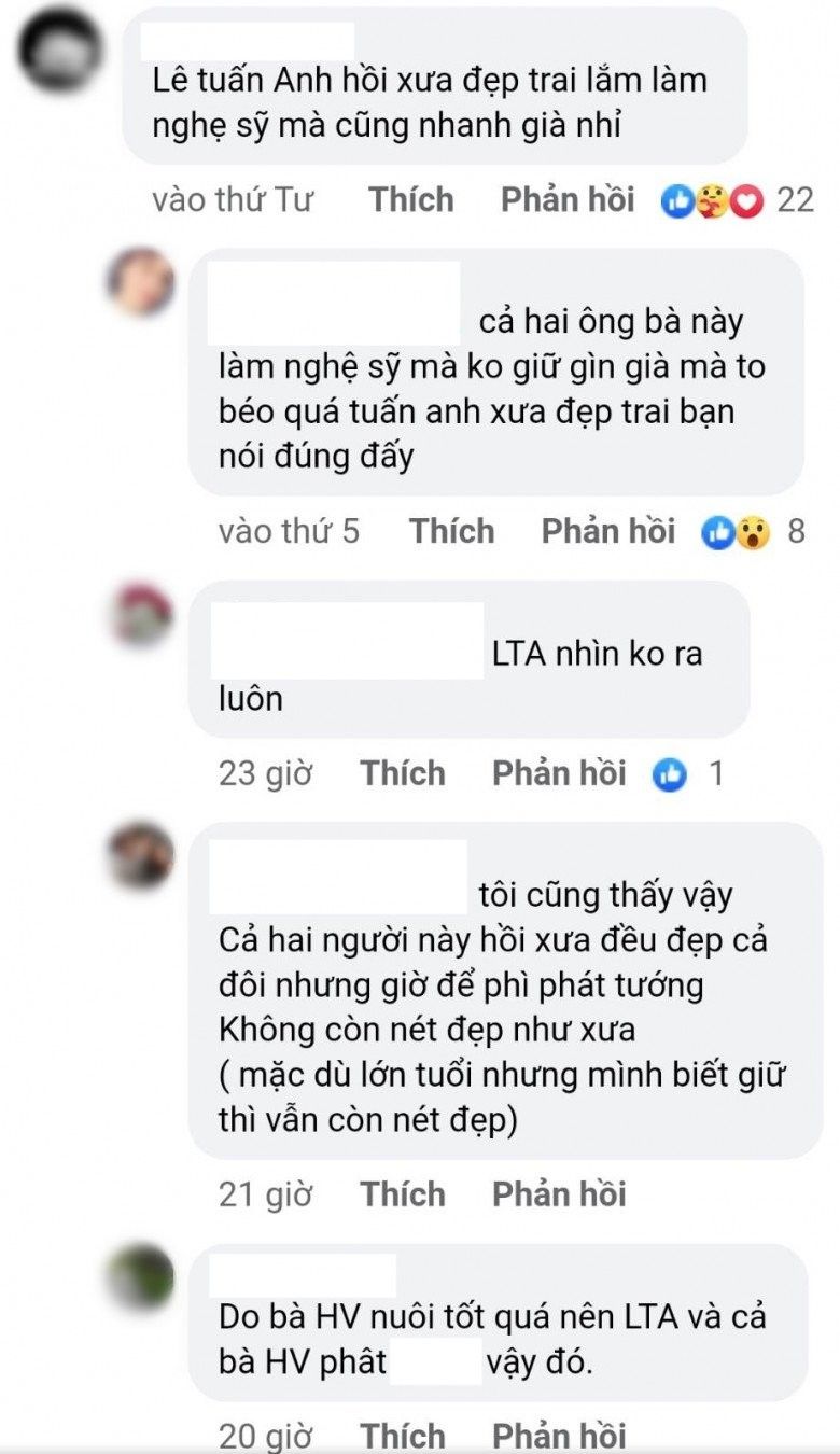 "Lê Tuấn Anh ngày xưa đẹp trai lãng tử. Giờ nhìn khác quá không nhận ra nổi", "Mặt trời đã đổi màu tóc thời gian... nhưng vẫn là mãi mãi của bạn!","Lê Tuấn Anh hồi xưa đẹp trai lắm, làm nghệ sĩ mà cũng nhanh già nhỉ", "Cả hai người này hồi xưa đều đẹp cả đôi nhưng giờ để phì, phát tướng. Không còn nét đẹp như xưa", "Hồng Vân nuôi tốt quá nên Lê Tuấn Anh và cả Hồng Vân đều phát tướng vậy đó"... dân mạng bình luận.