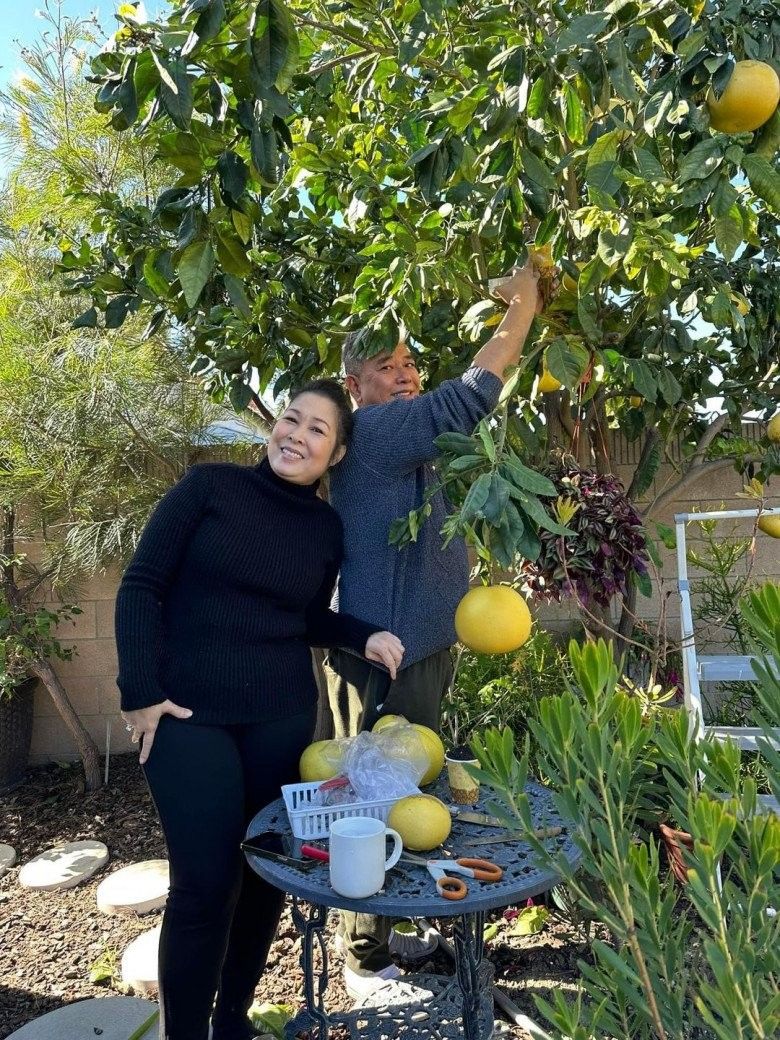 Dù ngoại hình già đi theo thời gian nhưng Hồng Vân và chồng vẫn có tâm hồn trẻ trung, vui tươi bên nhau. Mới đây cô cũng khoe ảnh cùng ông xã trong vườn nhà bạn thân ở Mỹ: "Bà bạn Hồng Đào thuê 2 đứa tui tới làm vườn cho bả, làm xong bả trả công bằng mấy trái bưởi? Ủa alo alo chị Đào???"