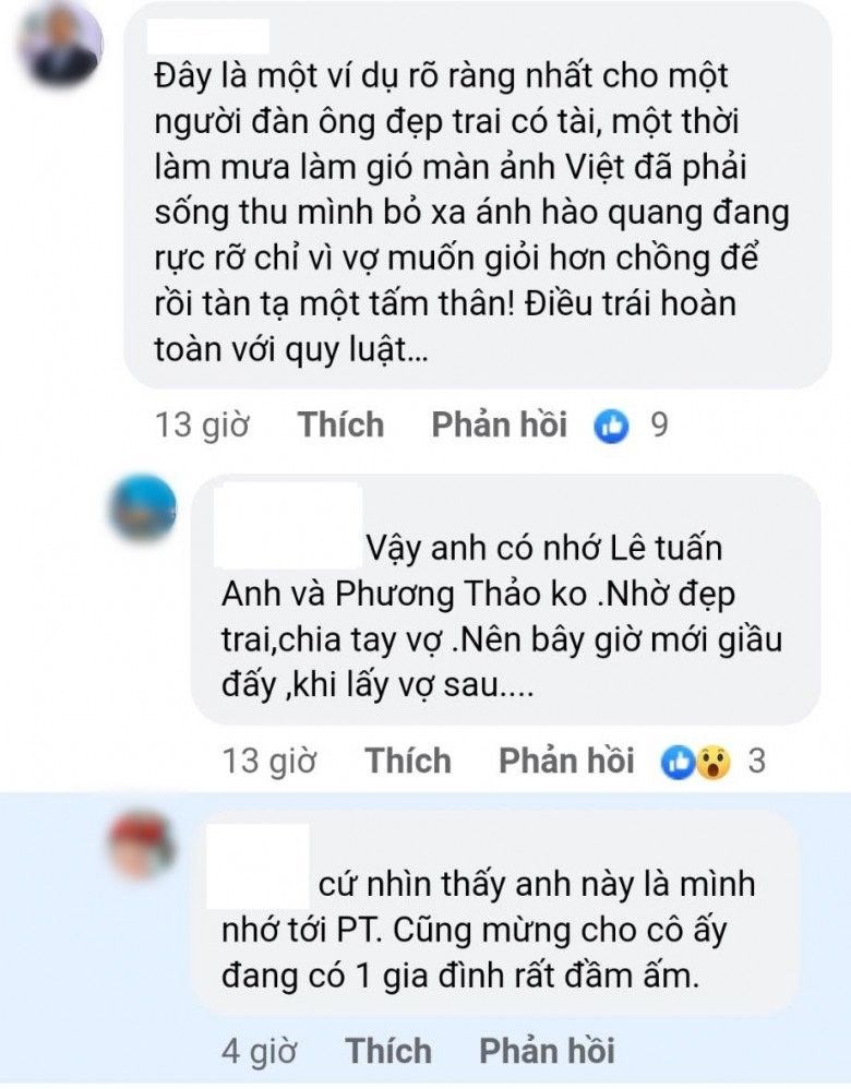 Fan cho rằng người đàn ông "làm mưa làm gió" màn ảnh Việt đã bỏ xa ánh hào quang rực rỡ vì muốn vợ tỏa sáng. Cuộc hôn nhân cũ của anh với ca sĩ Phương Thảo cũng được một số dân mạng "khui" lại. Sau chia tay, Lê Tuấn Anh và vợ cũ đều tìm được "một nửa" gắn bó của đời mình.