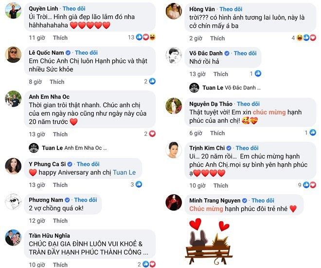Chính Hồng Vân phải thốt lên trước "món quà" của ông xã: "Trời, có cả ảnh tương lai luôn, này là cỡ chín mấy á ba". Rất nhiều sao Việt cũng bày tỏ khoái chí. Quyền Linh bình luận: "Úi trời, hình già đẹp lão đó nha haha". Bà xã Dạ Thảo của Quyền Linh cùng Trịnh Kim Chi, Y Phụng và nhiều nghệ sĩ khác cũng mừng cho hạnh phúc của vợ chồng Hồng Vân.